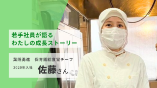 今回お話を伺ったのは、保育園の給食調理員として活躍する新卒入社5年目の佐藤さん。佐藤さんは4年目でチーフに就任しました。若手ながらも働く仲間とのコミュニケーションを大切にしながら、日々安全・安心な給食作りに取り組んでいます。