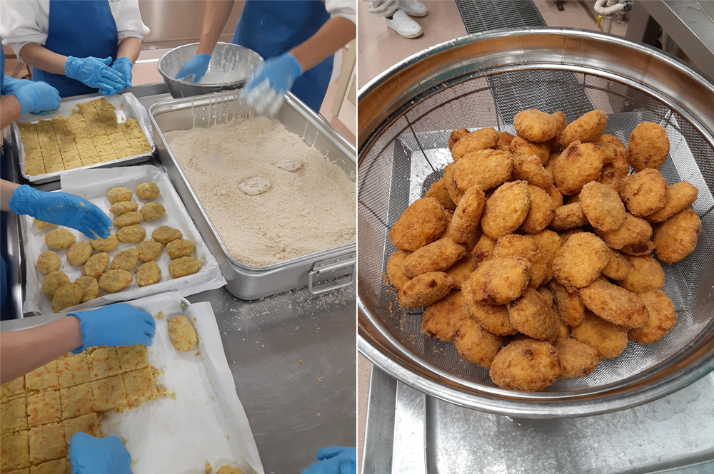 こどもたちに大人気のサツマイモコロッケ。潰したサツマイモを他の具と混ぜ合わせ、形を整えて揚げる工程。チーム一丸になって作り、きれいでおいしいコロッケが完成✨ こどもたち、先生ともに皆さん大喜びでした!