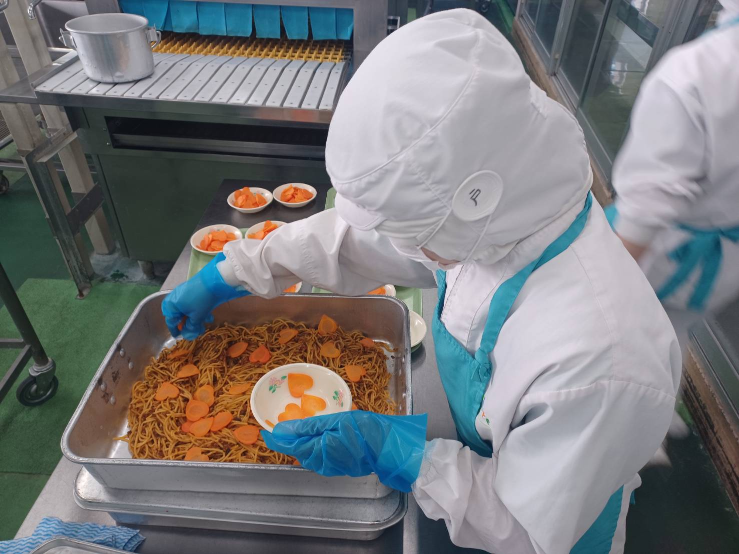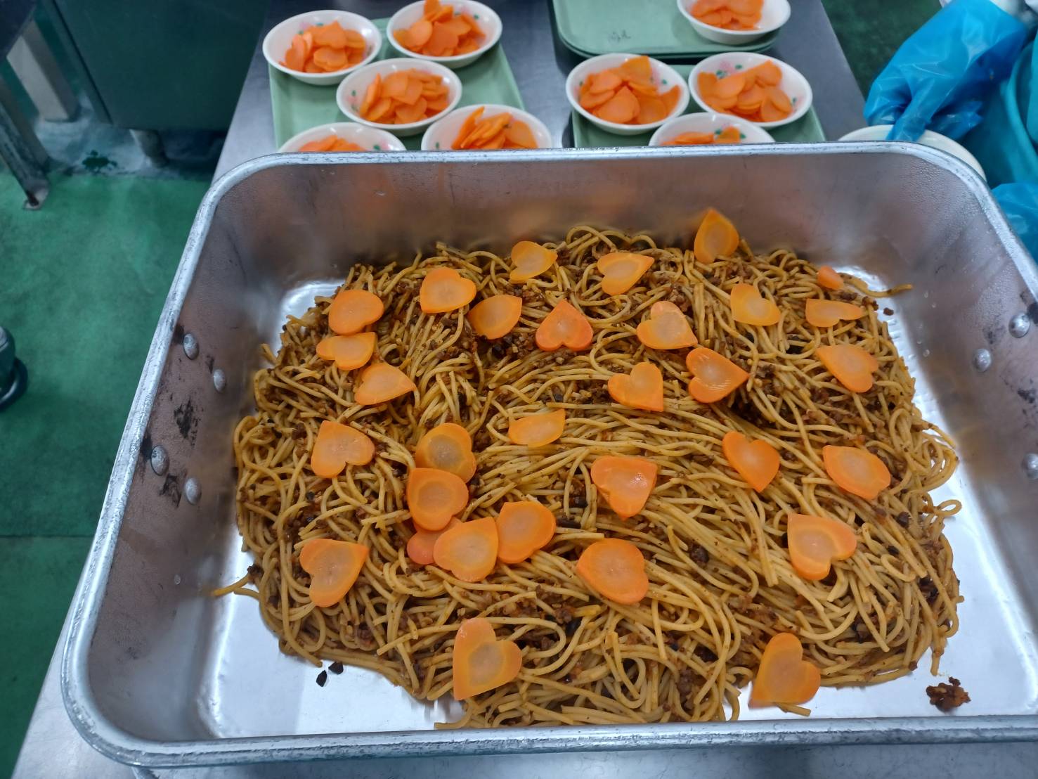 栄養士先生と打ち合わせて、ニンジンはハートに型抜きしたものも混ぜました❤ スパゲッティの上にハートを散らすと、こどもたちも大喜びでした♪
